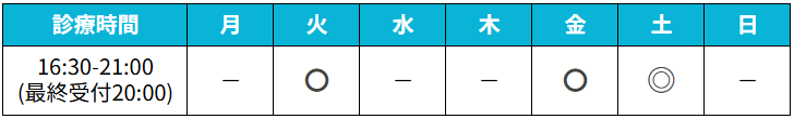 ※ご連絡は基本的にメールにて、診療時間内(火曜日・金曜日16:30〜21:00、隔週土曜日13:00〜17:00)でのご対応となります。